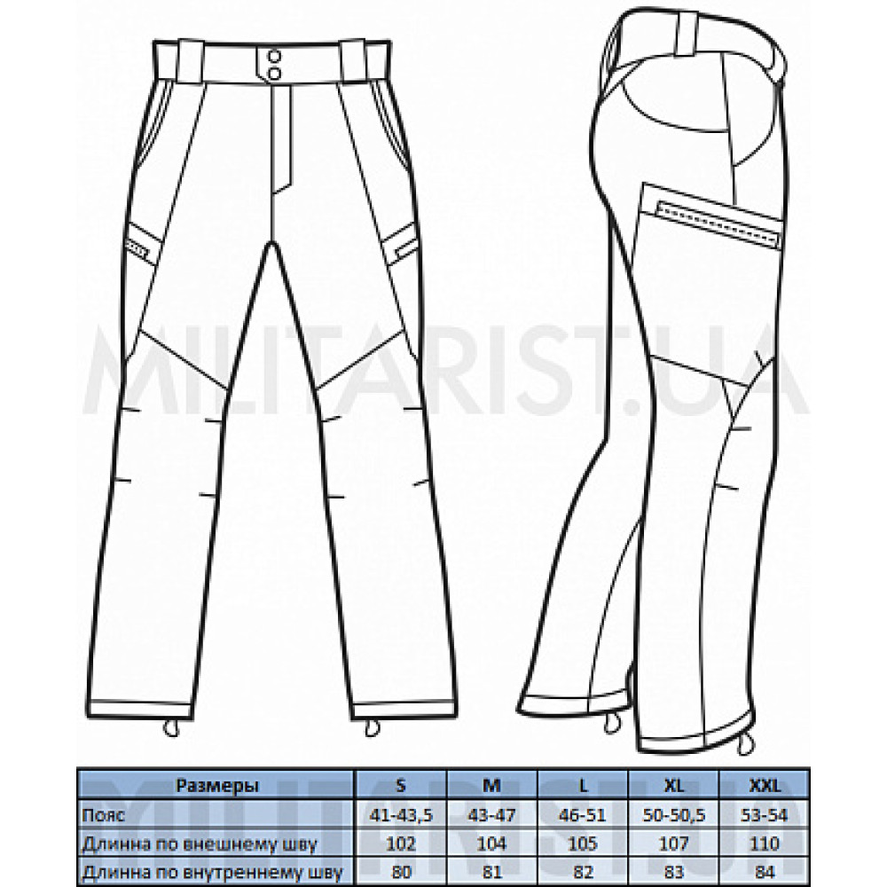 Стійкість проти вітру і води завдяки тканині SoftshellПрямий крій з високим поясом2 бічні кишені2 задні відкриті кишені 2 карго кишені з водозахисними блискавками Збільшена задня частина пояса захистить низ спини від вітру і холодуВнизу штанин – еластичний шнур для регулюванняШирокі петлі для ременя