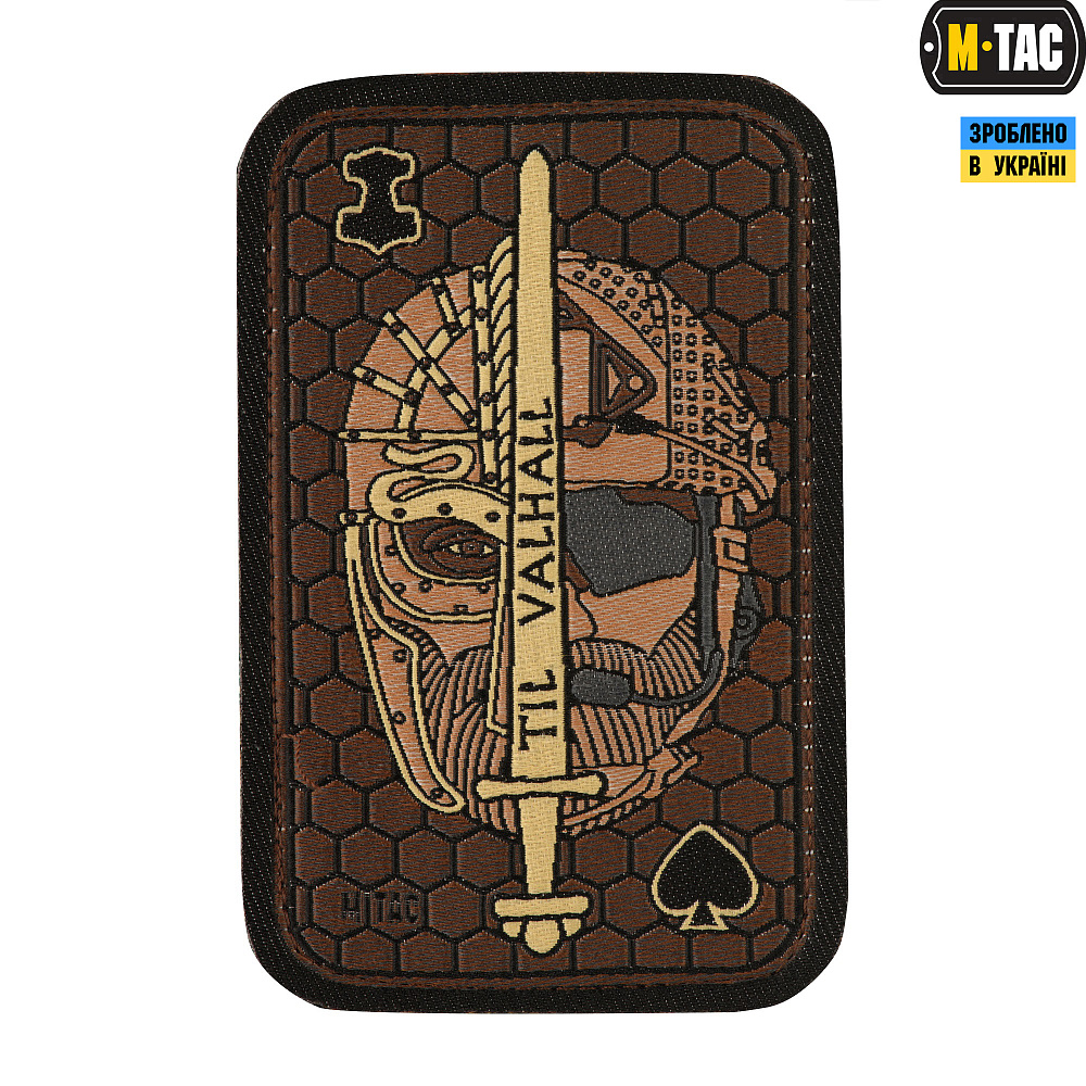 Нашивка від бренду M-Tac "Ми полюємо - У Вальгалу". На створення цієї нашивки дизайнерів бренду надихнуло відоме відео норвезьких бійців в Афганістані. В Афганістані, підірвавшись на фугасі, загинув Claes Joachim "Jokke" Olson боєць батальйону "Telemark". Його загибель спровокувала поява у солдатів батальйону нашивки з написом "Jokke - Ми ніколи не забудемо". Командир батальйону, стоячи над труною накритим прапором, сказав: Ми будемо мститись за тебе, Jokke! Офіцер прокричав потрійне TILL VALHALL, і його воїни підтримали командира кличем у відповідь.