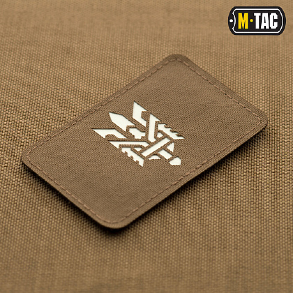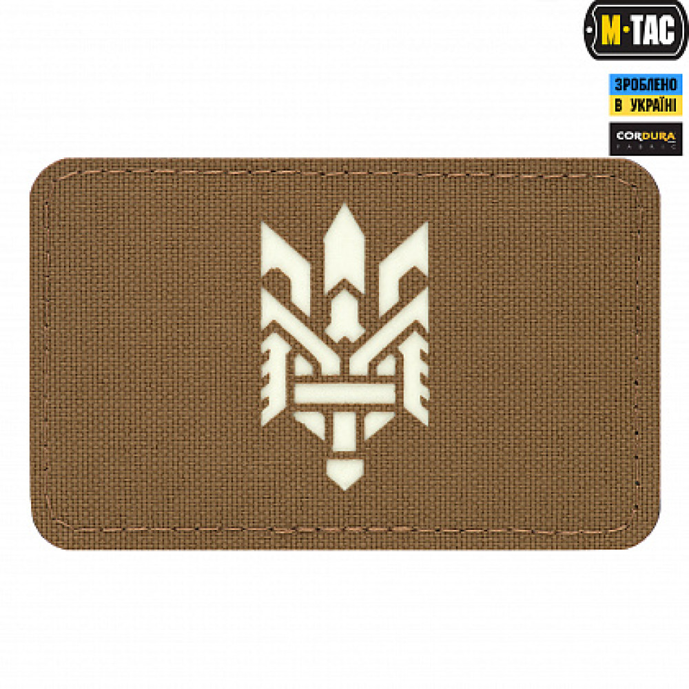 M-Tac н арукавна нашивка Тризуб (стилізація) - так званий "Morale patches" - кріпиться на нарукавний майданчик з велкри-липучки, (на самому патчі зі зворотного боку пришита липучка у відповідь), або на спорядження - рюкзаки, каски та ін. Статутними не є, але у зоні БД за це не карають. Зображення виконане зі світлонакопичувального матеріалу, що світиться в темряві.