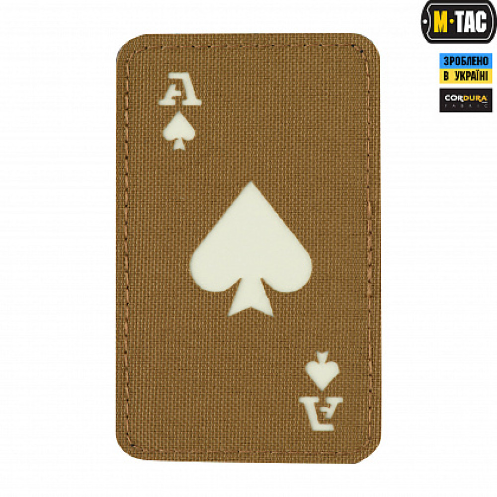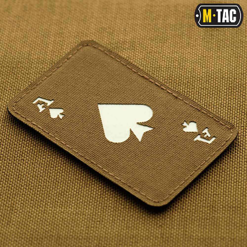 M-Tac нашивка Ace of Spades Laser Cut. Американець який служив у В'єтнамі в 1967-1968 говорить про те, як інтерпретувався туз пік: "Туз пік був картою смерті або картою носіїв смерті. Його використання у В'єтнамі означало приблизно "Я розумію, що моя робота вбивати ворогів. І я готовий це робити". Думайте про це як про антипод знаку світ (peace). Зображення виконане зі світлонакопичувального матеріалу, що світиться в темряві.