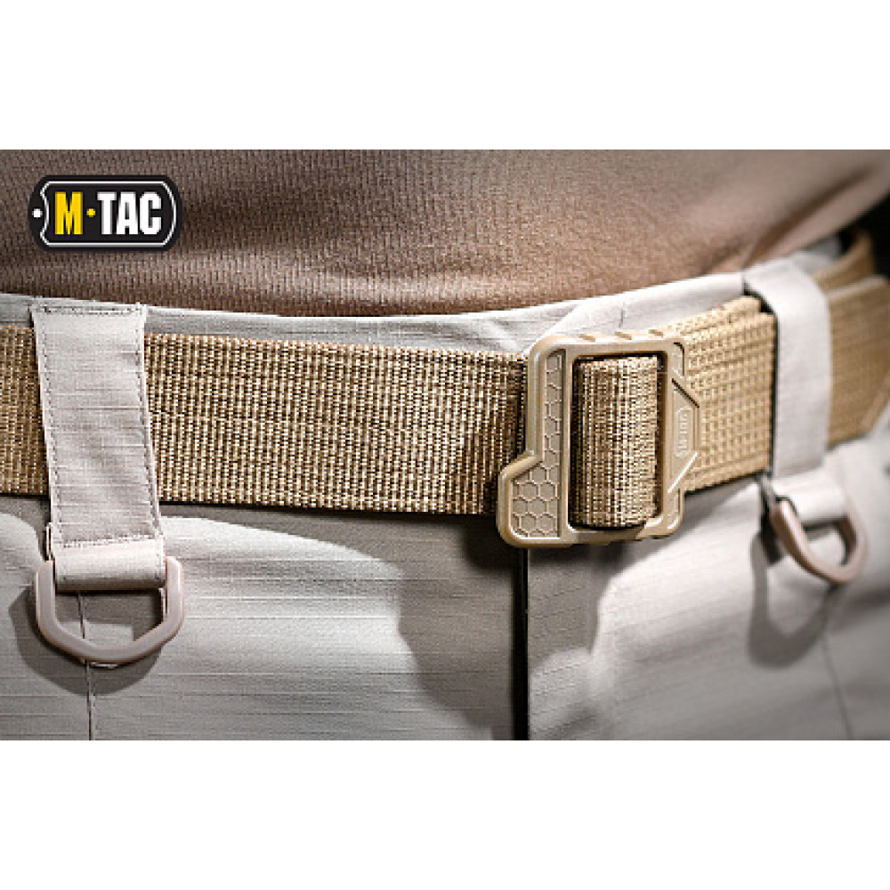 M-Tac ремінь Double Duty Tactical Belt призначений для постійного та довгострокового використання. Ремінь складається з двох міцних нейлонових стрічок, сформованих між собою міцною ниткою. Щільність матеріалу дозволяє носити на ремені кобури та підсумки. Фіксується ремінь на поясі за допомогою універсальної пряжки із міцного полімеру.