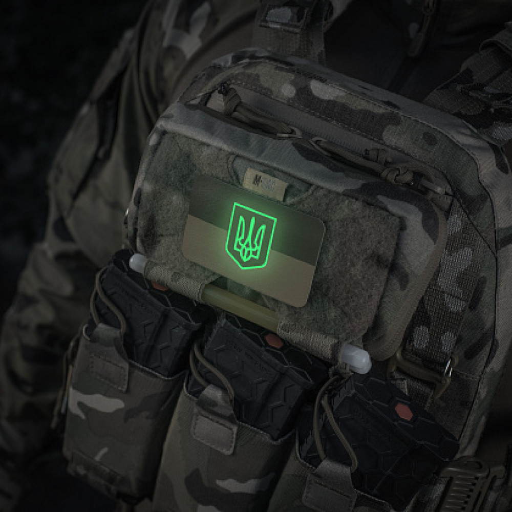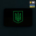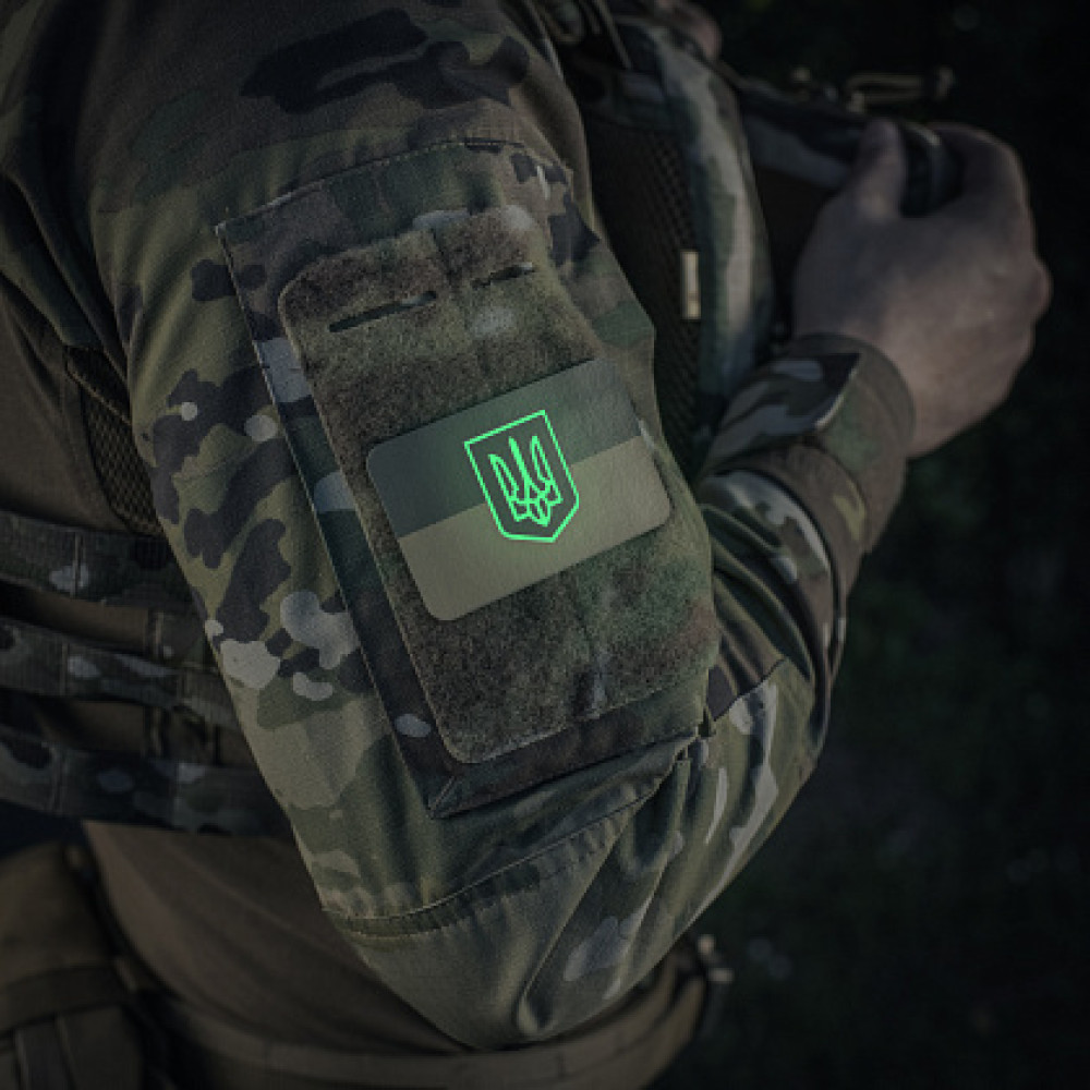 Нашивка виготовлена за новою технологією з нанесенням повнокольорового друку. Зображення малого Герба України зроблено зі світлонакопичувального матеріалу, що світиться у темряві. Кріпиться на одяг, кепки, сумки та рюкзаки за допомогою велкро липучки.