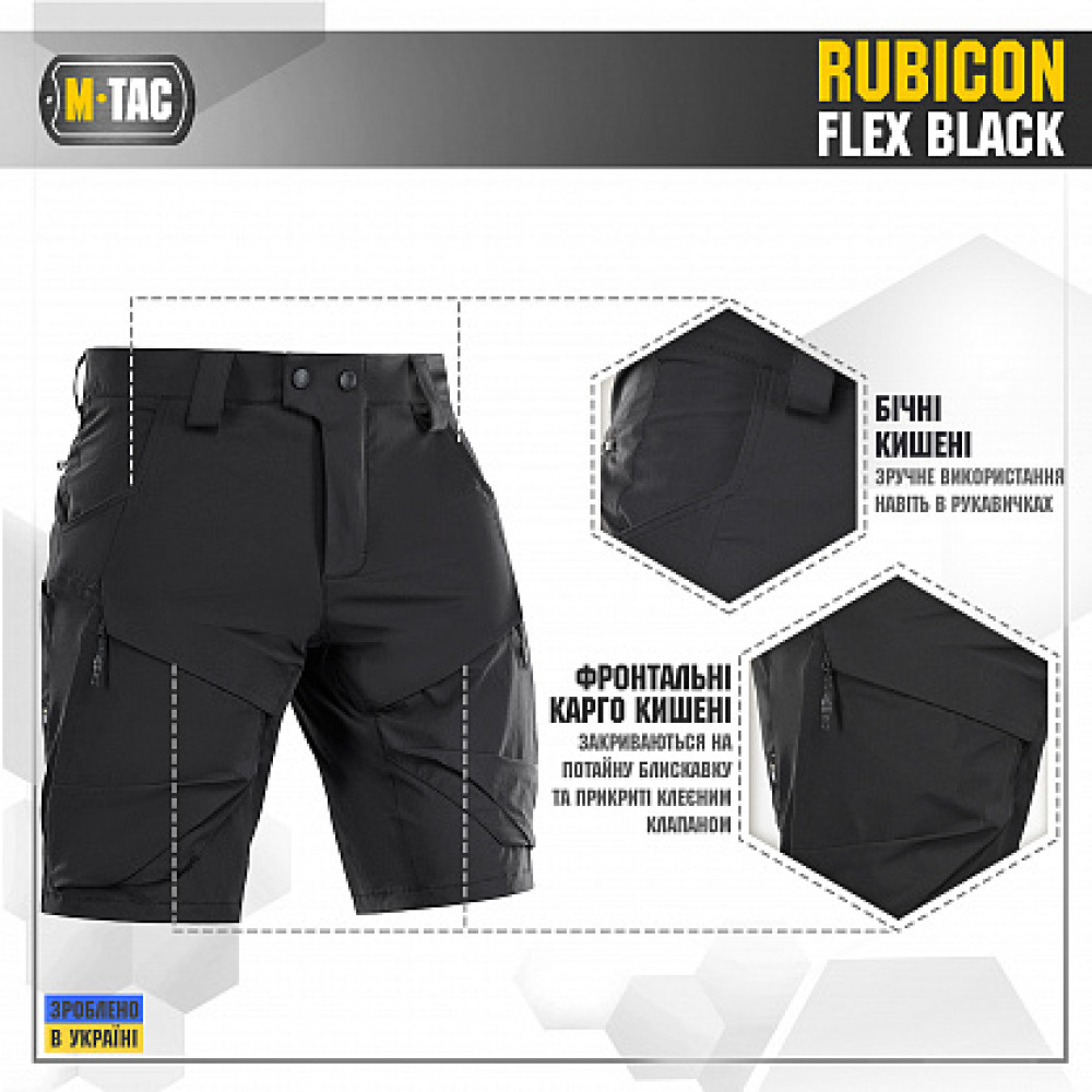 Шорти M-Tac Rubicon Flex Black – поповнення нашої літньої колекції. Незвичайний дизайн карго кишень, які скошені всередину та розташовані ближче до внутрішньої поверхні стегна, є особливістю даної моделі. Rubicon виконані з надсучасної тканини "4-Way Stretch" (85% нейлону і 15% спандексу) завдяки чому шорти тягнуться у всі 4 сторони і дарують комфорт при активній експлуатації. Також цей матеріал вкрай стійкий до вигоряння і має водовідштовхувальне просочення, що робить ці шорти чудовим вибором на літо.