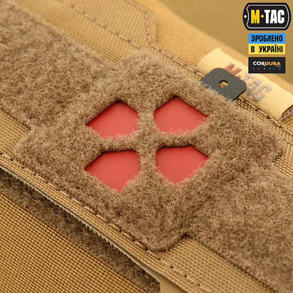 База підсумку виготовлена з ламінованої Cordura за технологією LaserCut. Ідентифікація медичного органайзера передбачена у двох кольорах – традиційний для аптечок червоний чи чорний, щоб зробити підсумок менш помітним.