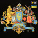 Оригінальна футболка з довгим рукавом «Україна понад усе» M-Tac містить інтерпретацію на тему великого Державного Герба України від відомого художника-ілюстратора Олексія Бондаренка. Цей принт уособлює цілий ланцюжок історичних подій. Зокрема, у центрі зображення розміщено малий Державний Герб України, герб Святослава та тризуб УНР. По обидва боки від щитів зображено щитоутримувачів: золотий лев, який вважається символом Галицько-Волинського князівства, та козак з мушкетом, який уособлює Військо Запорізьке. Вони символізують об'єднання Сходу та Заходу України. Поєднує принт шолом із короною – символ княжої влади у Київській Русі. Знизу розміщена стрічка в національних кольорах із написом «Україна понад усе», що ще більше посилює зміст виробу.