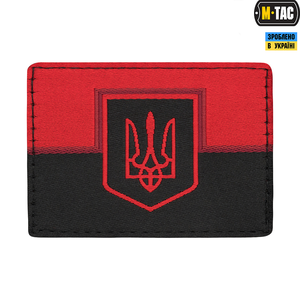 M-Tac н арукавна нашивка прапор червоно-чорний з Тризубом - так званий "Morale patches" - кріпиться на нарукавний майданчик з велкри-липучки, (на самому патчі зі зворотного боку пришита липучка у відповідь), або на спорядження - рюкзаки, каски. Статутними не є, але у зоні БД за це не карають. Державний Герб України (укр. Державний Герб України) — один із трьох офіційних символів держави, поряд із прапором та гімном. Центральною геральдичною фігурою герба є «тризуб» князя Володимира. Матеріал виготовлення – текстиль. Колір червоно-чорний. Вироблено в Україні