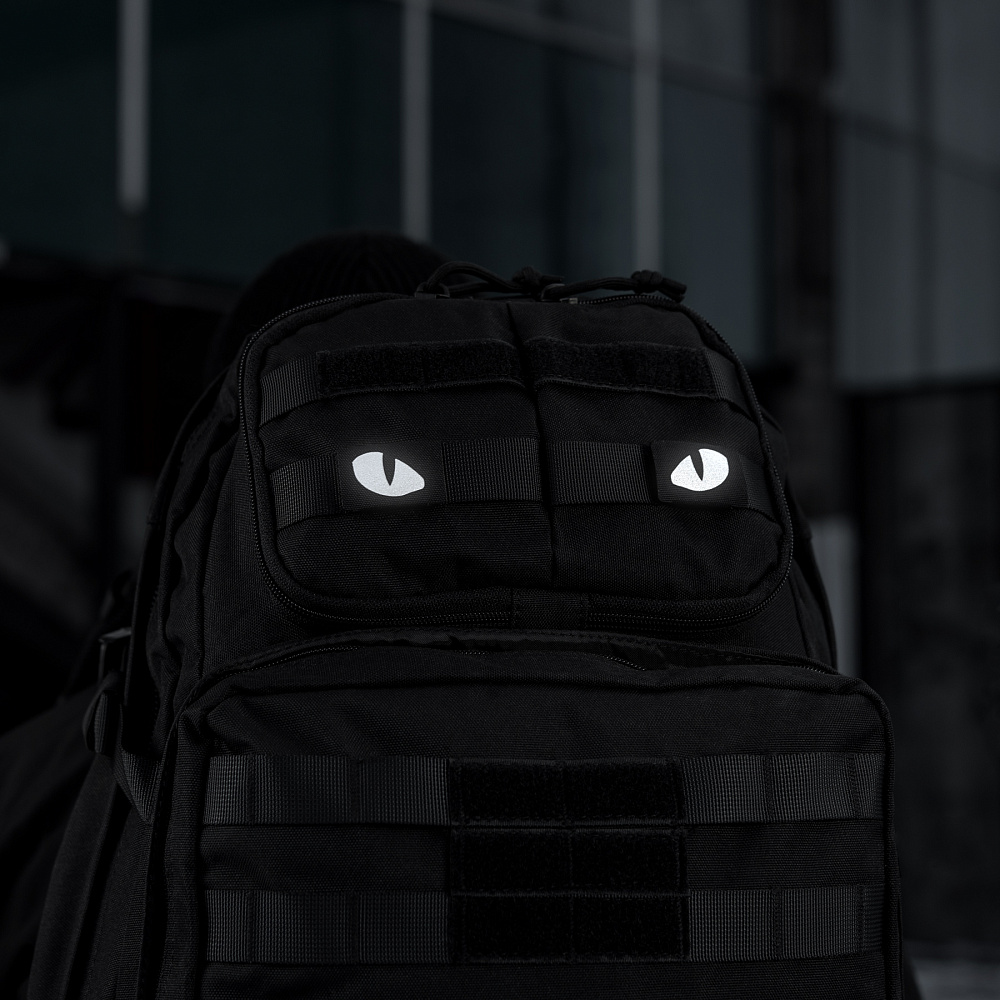M-Tac нашивка Tiger Eyes складається з двох частин, що кріпляться на MOLLE-інтерфейс за допомогою велкро липучок. На патчі зображені очі тигра, які виглядають дуже реалістично, світяться в темноті та привертають увагу.