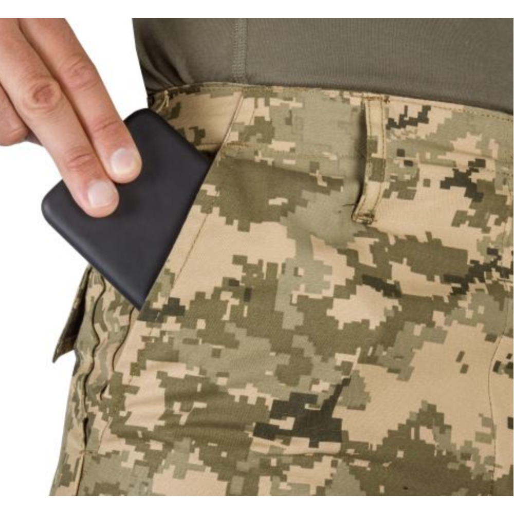 Штани мають шість кишень - дві прорізні передні, дві накладні настегнові та дві в нижній частині штанин. Накладні об'ємні кишені мають захисний клапан на липучках. Крім того, в горловині даних кишень розташовані еластичні утяжки, які перешкоджають мимовільному випаданню спорядження. Кишені в нижній частині штанин закриваються на клапан з липучкою та призначені для носіння різноманітного малогабаритного спорядження. Для збільшення зносостійкості штани продубльовані накладками в колінній та сідничній зонах. Також в області колін розташовані спеціальні кишені, які можуть бути використані для розміщення демпферних вставок. Для додаткового регулювання посадки всередині поясної частини та внизу штанини розташований шнурок-утяжка.