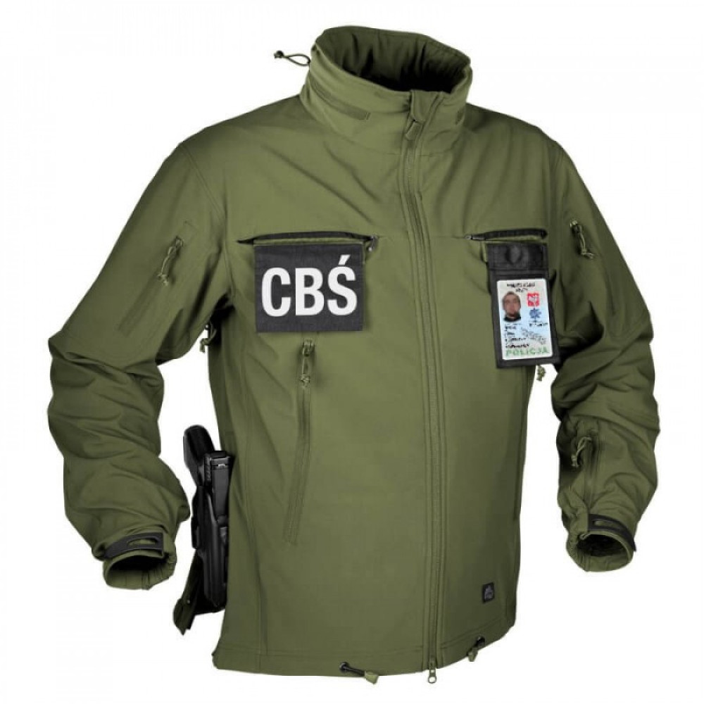 Helikon-Tex COUGAR® QSA™ + HID™ Jacket - Soft Shell Windblocker Olive green- легка демісезонна куртка з мембранної тканини, спеціально розроблена для представників поліцейських, силових і охоронних структур, які працюють в міських умовах. Завдяки унікальним властивостям високотехнологічних матеріалів, куртка відмінно утримує тепло, забезпечує надійний захист від сильного вітру і незначного дощу. У разі фізичних навантажень, відводить назовні зайве тепло і вологу, створюючи комфортну температуру тіла. Прихований в комірі капюшон, легко витягується назовні та регулюється за допомогою шоккорда з фіксаторами, виведеного в кишені. Куртка оснащена системою швидкого доступу Quick Side Access™ (QSA™), яка дає можливість миттєво дістати зброю або будь-який інший предмет, закріплений на поясі, одним плавним рухом, що значно впливає на швидкість реакції в надзвичайних, життєво-небезпечних ситуаціях. Система Hidden ID panels™ (HID™) складається з трьох кишень на грудях і спині, спеціально налаштованих під ідентифікаційні панелі різного розміру, які в залежності від обставин, носяться назовні або залишатися прихованими в кишенях. Куртка укомплектована двома порожніми панелями, які користувач може налаштувати методом вишивки або друку необхідної інформації.