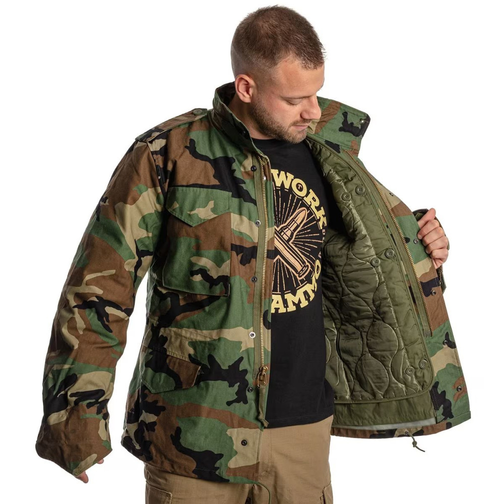 Helikon-Tex® M-65 Field Jacket US Woodland - легендарна польова військова куртка армії США з 1965 року. Виготовлена з високоякісного і міцного оригінального матеріалу NyCo (50% нейлону, 50% бавовни) сатинового плетіння, щільністю 330 г/м. Комплектується утеплюючою підстібкою (ALS-92) з стебаного нейлону, заповненого поліефіром. Польова куртка М-65 широко розповсюджена в арміях різних країн світу до цього часу. Вона стала основою для багатьох моделей одягу в стилі "мілітарі". Надзвичайно популярна серед цивільного населення, особливо мисливців, рибалок, туристів.