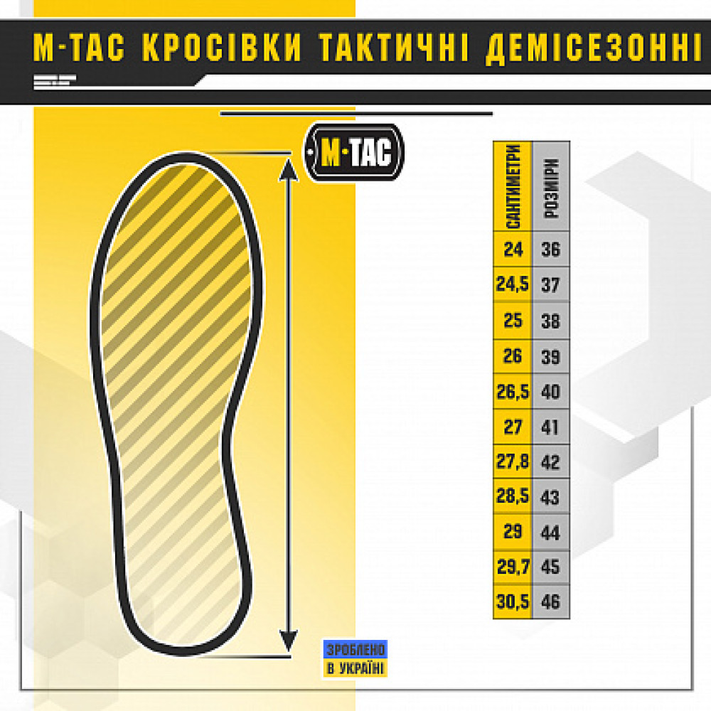 M-Tac кросівки тактичні демісезонні підійдуть як для гірського походу, так і для міста. Відрізняються сучасним дизайном та невеликою вагою. Зручне подовжене шнурівка дозволяє ідеально закріпити кросівок по нозі, а міцні шнурки не промокають і не ковзають. Кросівки призначені для трекінгу, бігу по бездоріжжю та активного відпочинку. Це красиве, надійне і зручне сучасне трекінгове взуття, яке відмінно сидить на ногах і надійно захищає від мінливостей погоди та складнощів рельєфу. Матеріали та технології. Верх кросівок виготовлений з високоякісної щільної шкіри (замша) та синтетичний поліестерний матеріал, що дозволяє кросівкам бути одночасно вологостійкими (дихаючими), зносостійкими та міцними. Обгумований шкарпетка та п'ята надійно захищає ноги від ударів і робить черевики більш зносостійкими. Деталі кросівок прошиті двома рядками. М'яка мембранна підкладка забезпечує ідеальний мікроклімат усередині кросівки та створює максимальний комфорт для ніг. Завдяки використанню спеціальної колодки при створенні кросівок, ця модель чудово підходить для тривалих походів та високих спортивних навантажень. Анатомічна устілка надає м'якості всієї внутрішньої конструкції черевика. Зносостійка рельєфна двокомпонентна підошва з поліуретану, носок додатково закруглений для покращення зчеплення. Підошва з різноспрямованим малюнком протектора зберігає гарне зчеплення з поверхнею під час ходьби та бігу.