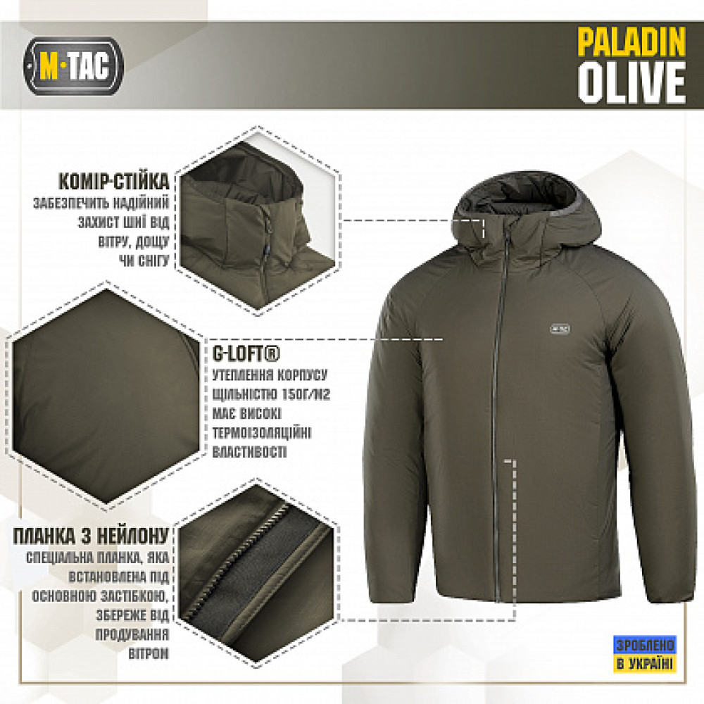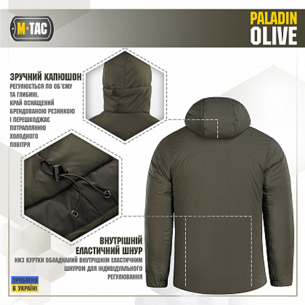 Куртка Paladin має 2 прикриті клапаном зовнішніх кишені на блискавці і один внутрішній для документів або дрібних речей. Край каптуру доповнений брендованою гумкою. Низ виробу має внутрішній еластичний шнур для індивідуального регулювання за обсягом.