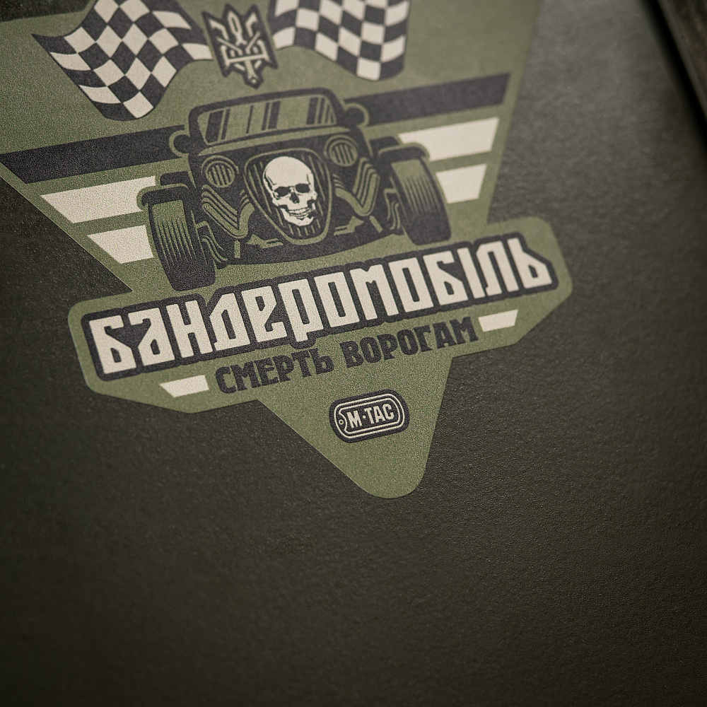 Бренд М-Тас не оминув увагою цю тему та випустив оригінальну наклейку, яка допоможе прикрасити ваш позашляховик чи седан. На стікері дизайнери зобразили "Бандеромобіль", який несе смерть ворогам.