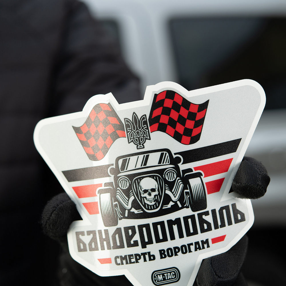 Бренд М-Тас не оминув увагою цю тему та випустив оригінальну наклейку, яка допоможе прикрасити ваш позашляховик чи седан. На стікері дизайнери зобразили "Бандеромобіль", який несе смерть ворогам. Світлонакопичувальні елементи наклейки світяться у темряві та привертають увагу.