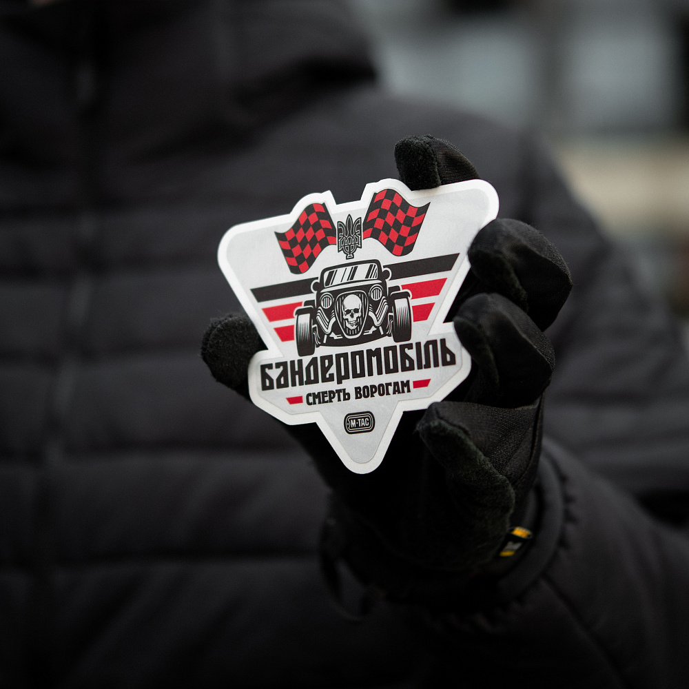 Бренд М-Тас не оминув увагою цю тему та випустив оригінальну наклейку, яка допоможе прикрасити ваш позашляховик чи седан. На стікері дизайнери зобразили "Бандеромобіль", який несе смерть ворогам. Світлонакопичувальні елементи наклейки світяться у темряві та привертають увагу.