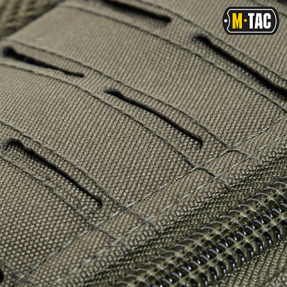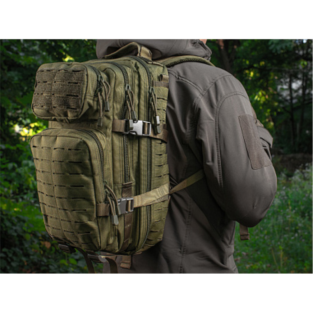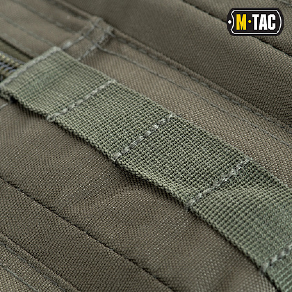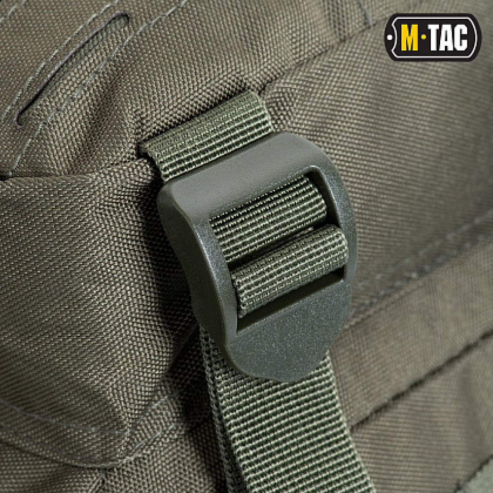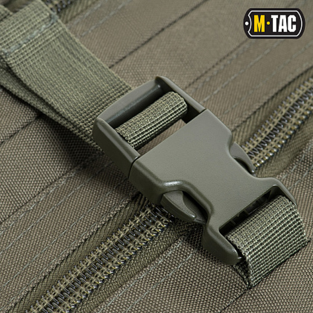 Рюкзак від бренду M-Tac із системою кріплення "Molle" має два великі основні відділи на блискавці. Спереду розташовані дві додаткові кишені на блискавці. Ремені для перенесення рюкзака за спиною, з м'яким наповнювачем і регулюються по довжині. З боку спини є одна велика кишеня з активно-дихаючою мембраною. Бренд M-Tac використовувала нову технологію зовнішнього кріплення модульних підсумків, замість звичайних нашивних PALS-строп, вирізавши лазером у шарі нейлону кілька рядів спеціальних отворів, які, у свою чергу, дозволяють кріпити стандартні підсумки з MOLLE-кріпленням та знижують загальну вагу виробу приблизно на 35%.