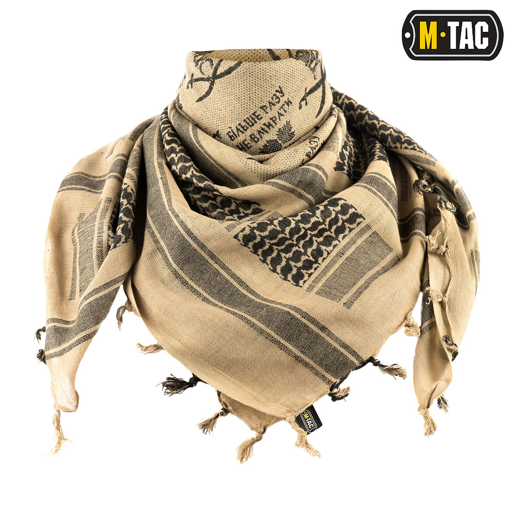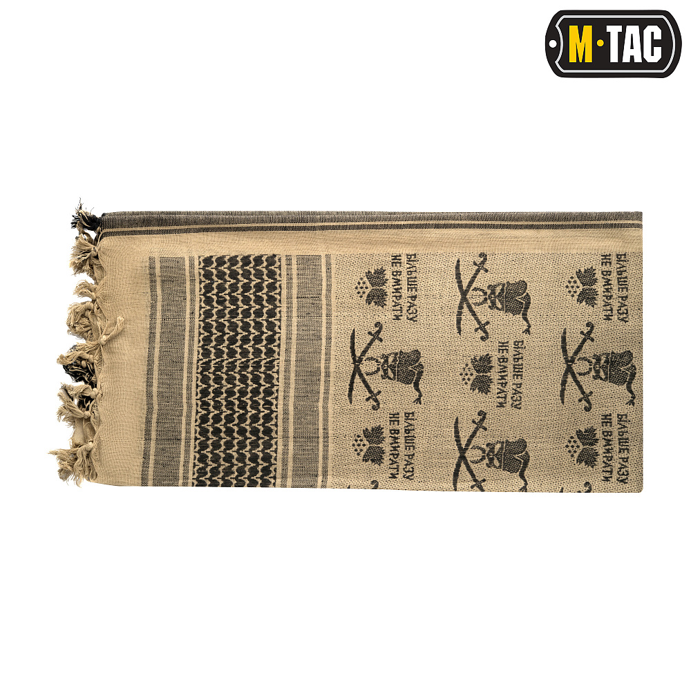 Тактичний пустельний M-Tac шарф шемаг із написом Більше разу не вмирати. Шарф типу "шемаг" (відоміший на території країн СНД як "арафатка") призначений для захисту області голови та шиї від впливу піску та сонця, а також для захисту від вітру за холодних погодних умов. Цей шарф використовується багатьма арміями світу.