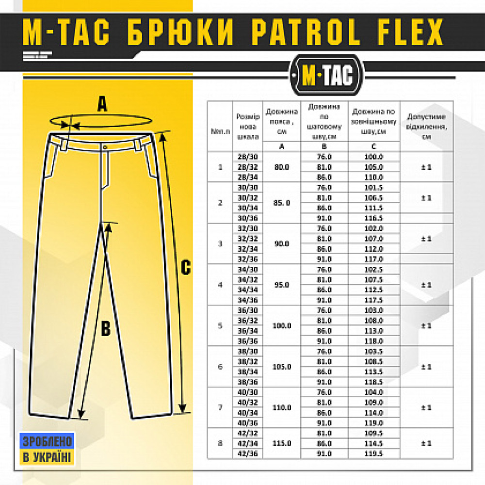 M-Tac штани тактичні Patrol Flex поєднують відносно непомітний зовнішній вигляд з міцними матеріалами і прихованим розширеним функціоналом, який в першу чергу націлений на співробітників охоронних структур і правоохоронних органів. захисним просоченням Teflon. кань з вмістом поліестеру і бавовни приємна до тіла, добре тримає колір і відрізняється високою міцністю. солідно. Штани застібаються на кнопку та блискавку YKK.