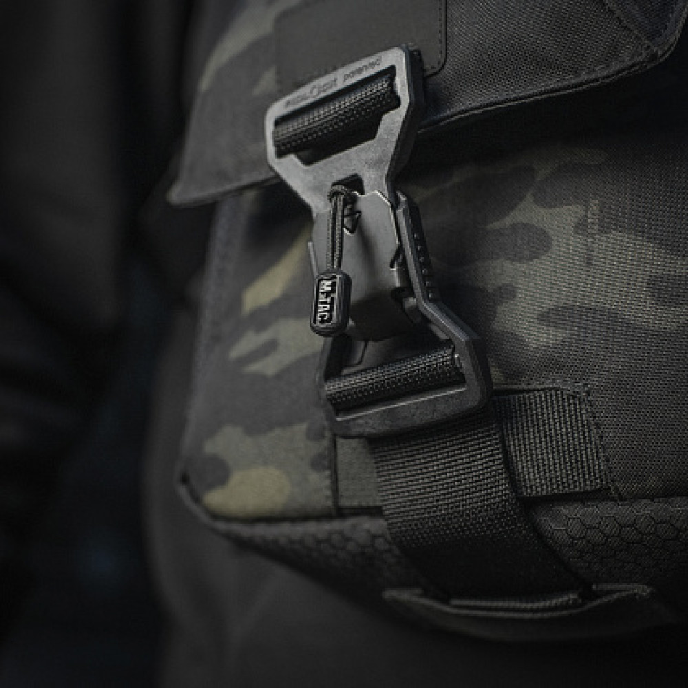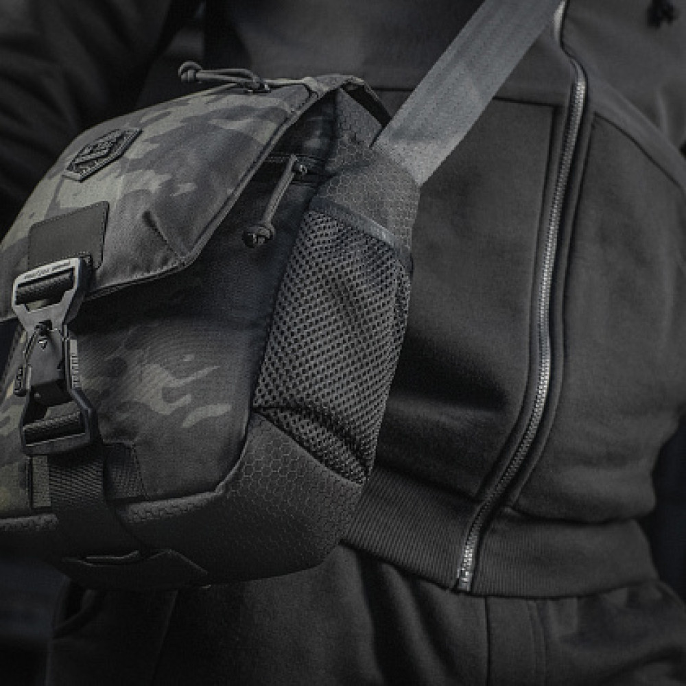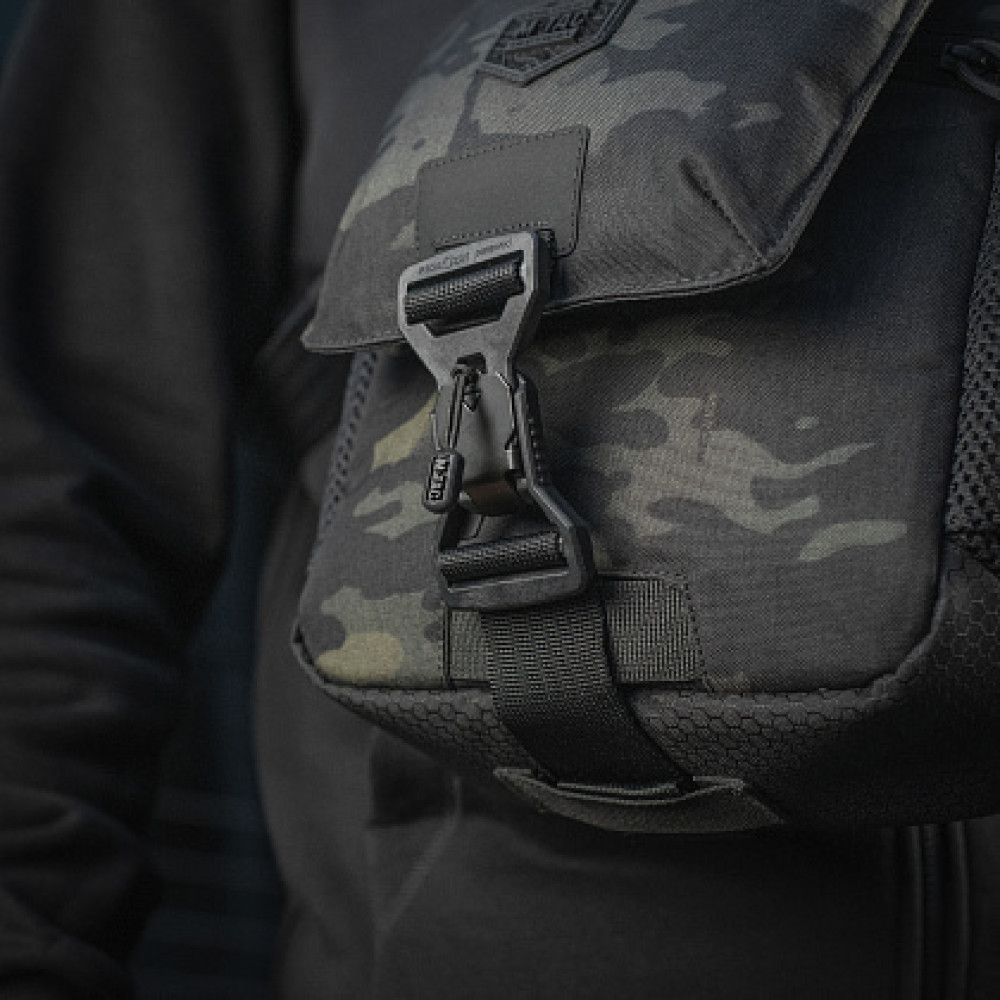 Виготовлена з Cordura Hex та Cordura 500D Multicam Black – надміцних матеріалів, стійких до стирання та механічних навантажень. Блискавки та пряжки від YKK та Woojin – світових лідерів з виробництва фурнітури. Сумка закривається магнітною застібкою Fidlock, яка розроблена в Німеччині та гарантує швидкий доступ до вмісту. Плечовий ремінь із м'якої нейлонової стропи регулюється по довжині.