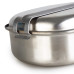 Сам комплект представлений двома основними частинами – сковорідка та кришка до неї. Всі деталі виготовлені з високоякісної нержавіючої сталі, тому цей набір стійкий до корозії та деформації. Внутрішня частина сковорідки, на відміну від оригінальної моделі, має сучасне антипригарне покриття, що робить процес приготування їжі та очищення максимально комфортним. Зовнішня сторона сковорідки обладнана складною ручкою для зручності користування, вона ж надійно фіксує сковорідку з кришкою в закритому положенні.