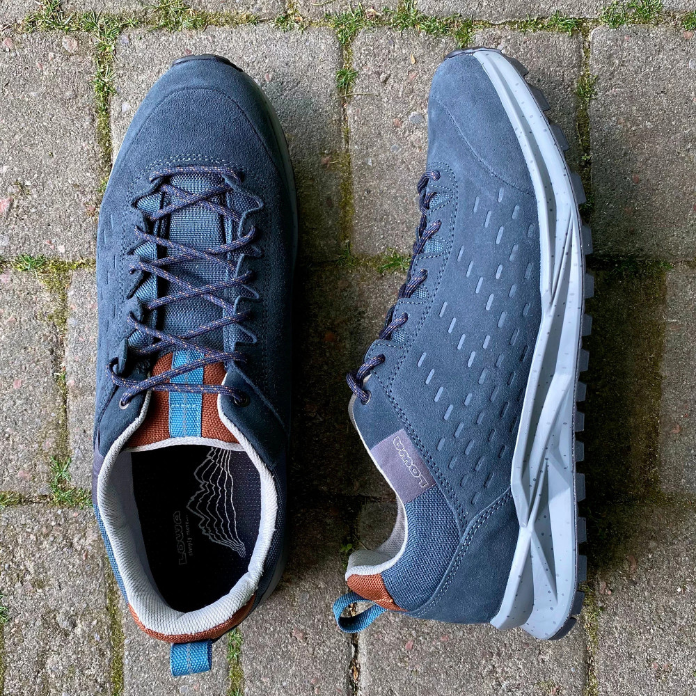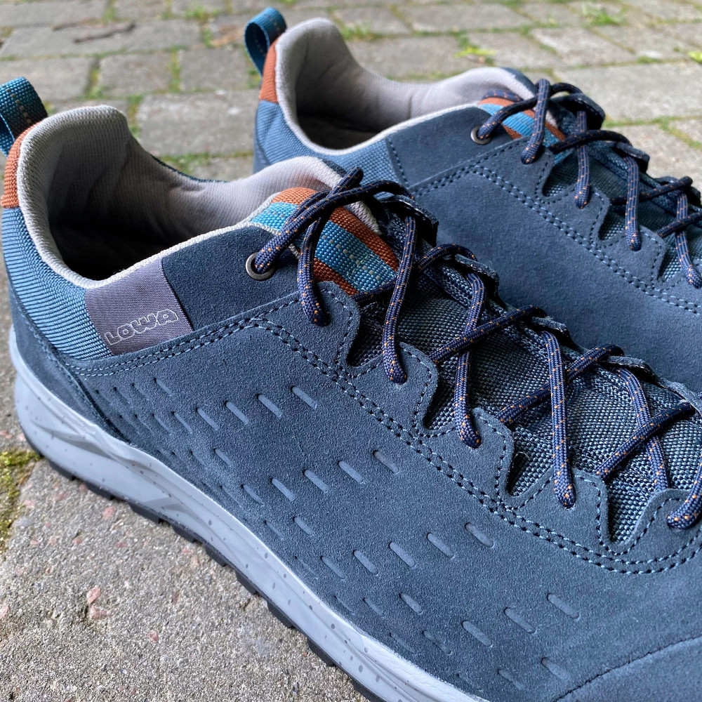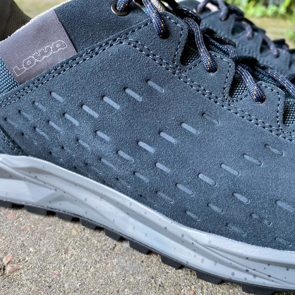 Верхня частина кросівок виконана із комбінації натуральної замші з текстильними вставками. Шкіра це міцний матеріал, який має гарні паропроникні та вологозахисні властивості. У проміжному шарі підошви розміщена LOWA DynaPU®+. Це спеціально розроблений пінний прошарок, який грає ключову роль в амортизаційних властивостях взуття. Завдяки комірчастій структурі ця міжпідошва забезпечує покращений ефект відскоку під час бігу. Також при постійному використанні LOWA DynaPU®+ не втрачає своїх високих експлуатаційних якостей.