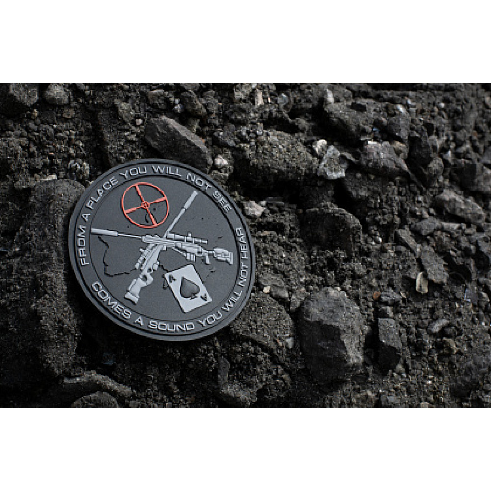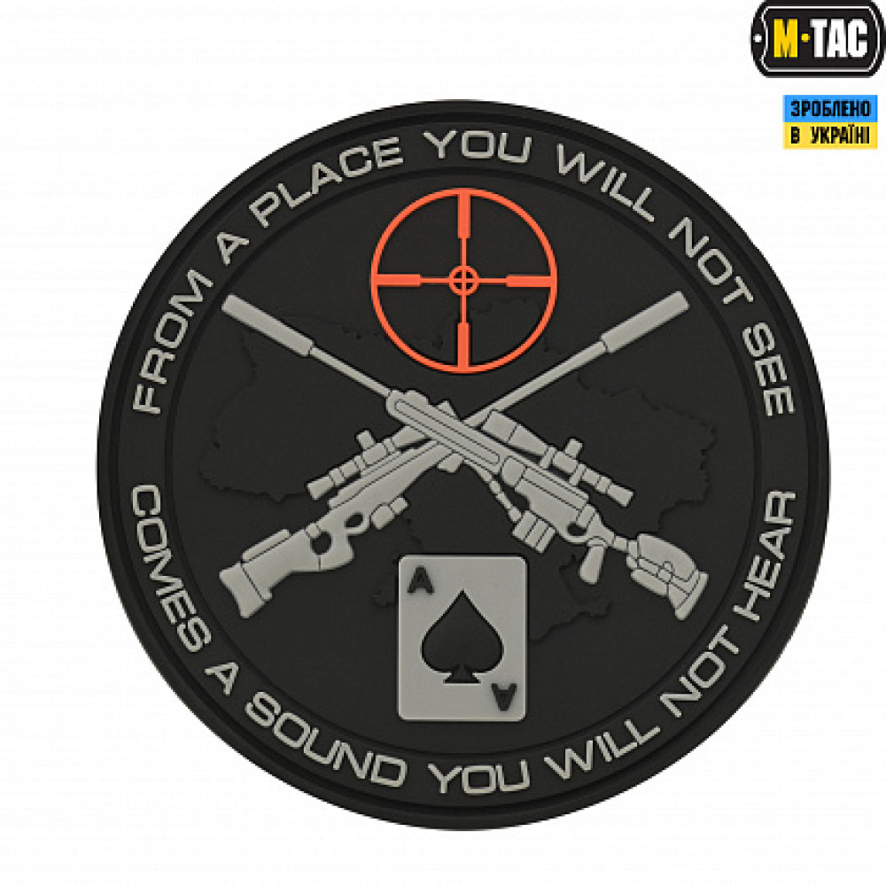Нарукавная нашивка Ukrainian Snipers - так называемый "Morale patch". На M-Tac нашивке Ukrainian Snipers изображены скрещенные винтовки на фоне карты Украины и надпись по кругу: From a place you will not see, comes a sound you will not hear (Из места, которое ты не увидишь, прилетит звук, который ты не услышишь). Патч крепится на нарукавную площадку из липучки "велкро", (на самом патче с обратной стороны пришита ответная часть липучки), либо на снаряжение - рюкзаки, каски и прочее. Уставной, как и все "моральные" патчи, данная нашивка не является, но может носиться как в зоне БД, так и за ее пределами.