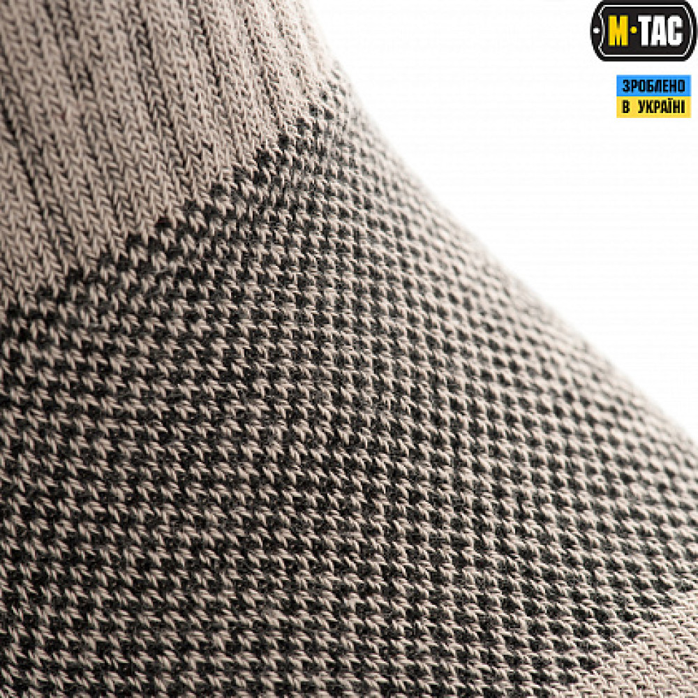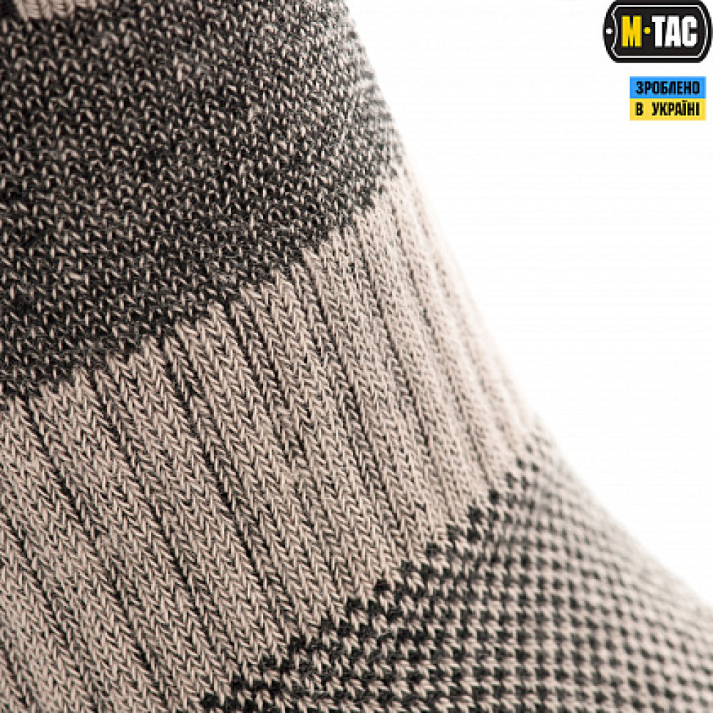 В конструктивные особенности носка высокого M-Tac входят специальные термозоны и демпферные участки в носочной и пяточной части с переходом на подъем ноги, защищая голеностопный сустав от вывихов и механических воздействий. Для улучшения характеристик при интенсивной хотьбе добавлен поперечный фиксатор свода стопы, который не дает носку в нижней части сбиваться в "гармошку". Широкая резинка равномерно распределяет нагрузку для удержания носкана на голени. Вся площадь ступни амортизируется благодаря внутреннему махровому плетению, что позволяет равномерно распределять нагрузку массы тела по всей ее поверхности. Трекинговые носки с текстурными термозонами большую часть влаги поглощают и капилярным путем по существующим вентиляционным каналам выводят наружу через верх обуви. Кроме того они отлично сочетаются и с мембранной обувью, так как процесс отвода влаги наружу происходит еще быстрее