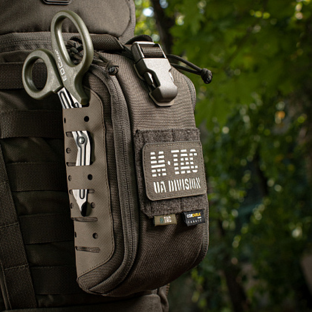 M-Tac подсумок медицинский Elite Rip Off открывается полностью одним движением за ручку, давая возможность получить доступ ко всему содержимому и при этом ничего не высыпается. Часть содержимого аптечки фиксируется на резинке (или опционально на паракорде) на внутренней части открывающегося клапана. Там можно закрепить перевязочные пакеты, бинты, пластыри, перчатки и т.д. По бокам подсумка сделаны накладки с прорезями на которые можно навесить дополнительные подсумки или снаряжение. Сделаны накладки из прочного и в то же время эластичного материала. С первого взгляда вы можете принять за резину. Но это схожесть только внешняя. Так как этот материал называется полиэтиленовый эластомер. С продолжительным сроком службы, стойкий к истиранию. Не боится ни высоких ни низких температур. Также на фронтальной части аптечки находиться велкро для размещения необходимых нашивок.