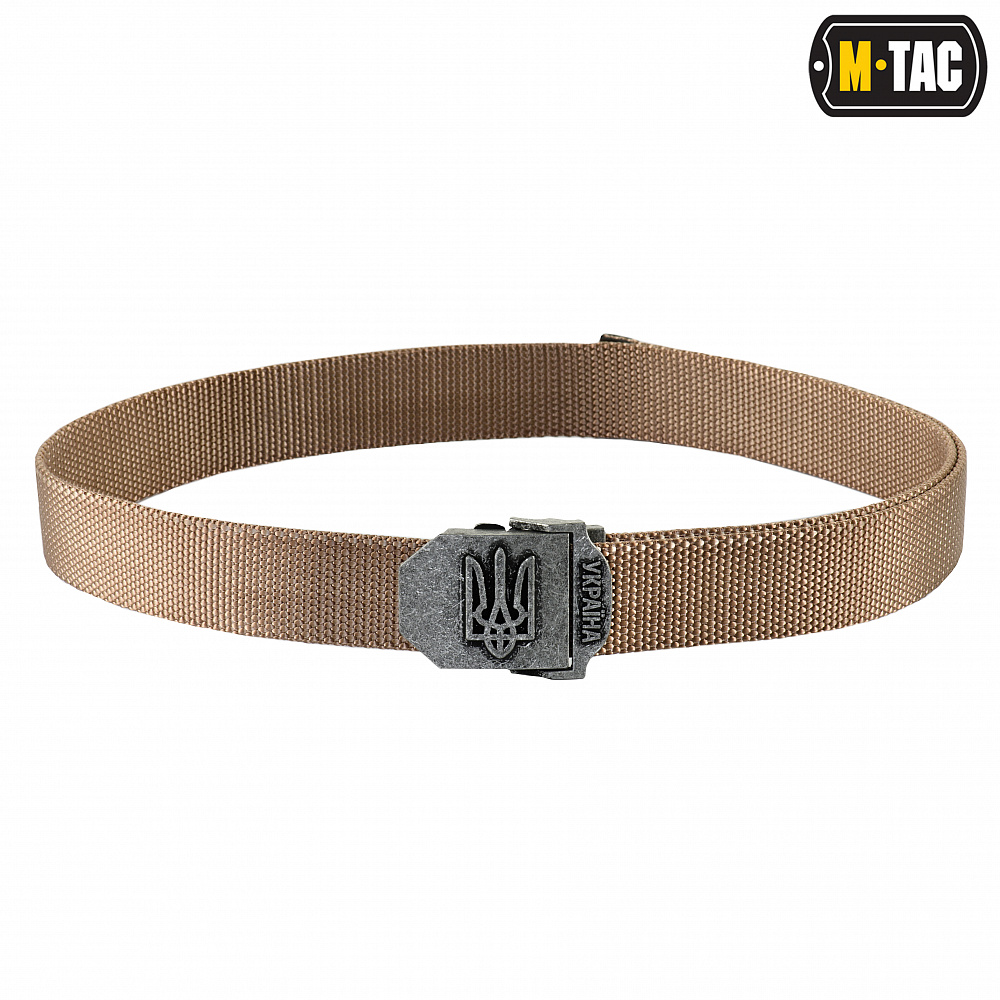 M-Tac поясний (брючний) ремінь в стилі мілітарі. Досить зручний ремінь для носіння на кожен день хоч під військові штани, хоч під джинси або шорти. Регулюється за рахунок зручної у використанні пряжки із зображенням емблеми Тризуба (Державний Герб України - один з трьох офіційних символів держави, поряд з прапором і гімном. Центральною геральдичною фігурою герба є «тризуб» князя Володимира.). Ремінь чудово підійде військовим, працівникам правоохоронних органів, охоронцям, мисливцям, туристам, рибалкам і просто любителям військової тематики.
