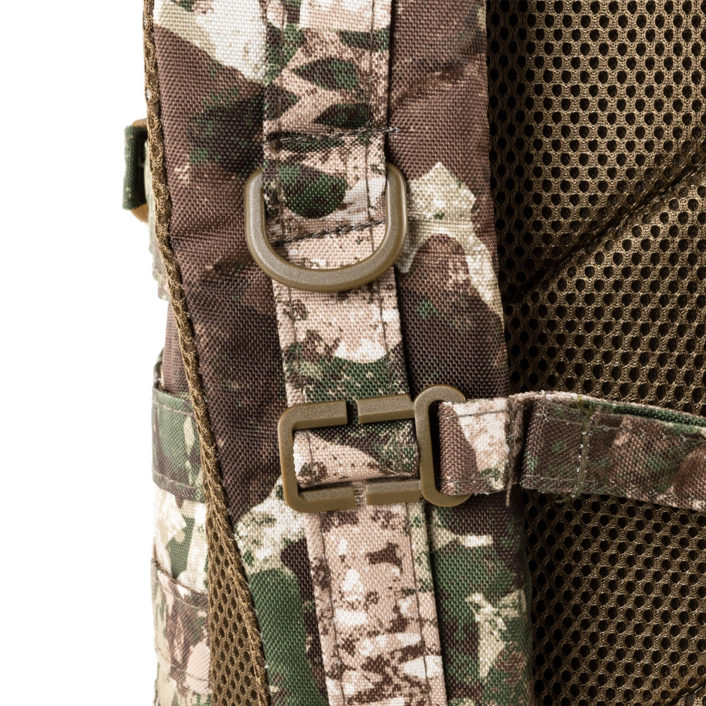 Важной частью этого рюкзака является множество точек крепления снаряжения с четырех сторон благодаря системе MOLLE. Кроме этого, для крепления снаряжения можно использовать стропы с фастексами и затяжками по бокам и снизу. Широкие плечевые лямки имеют ширину 70 мм и гарантируют комфортное длительное использование. К тому же здесь прикреплены два D-образных кольца для крепления мелких вещей. Поясная система представлена фастексом и двумя затяжками с широкими стропами, которые вместе с регуляцией плечевых лямок, сделают максимально комфортной посадку рюкзака по фигуре и росту. Спинка обеспечивает отличную вентиляцию в самых разных условиях благодаря своей конструкции и применяемым материалам.