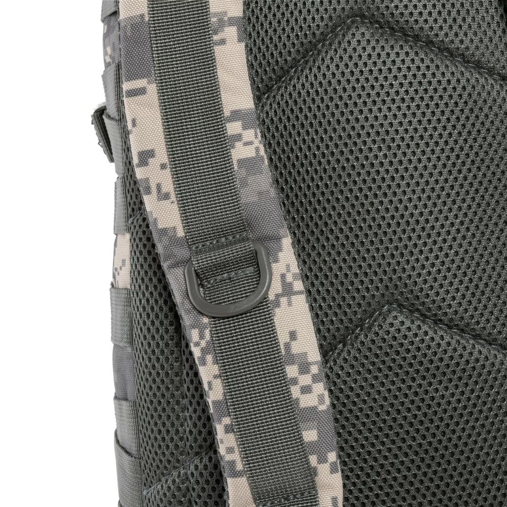 Важливою частиною цього рюкзака є безліч точок кріплення спорядження з чотирьох сторін завдяки системі «MOLLE». Окрім цього для кріплення спорядження можна використовувати стропи з фастексами й затяжками по боках і знизу. Широкі плечові лямки мають ширину 55 мм і гарантують комфортне тривале використання. До того ж тут прикріплено два D-подібних кільця для кріплення дрібних речей. Поясна система представлена фастексом і двома затяжками з широкими стропами, які разом регуляцією плечових лямок, зроблять максимально комфортною посадку рюкзака по фігурі й зросту. Спинка забезпечує відмінну вентиляцію в найрізноманітніших умовах завдяки своїй конструкції й застосованим матеріалам.