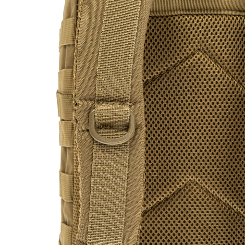 Важливою частиною цього рюкзака є безліч точок кріплення спорядження з чотирьох сторін завдяки системі «MOLLE». Окрім цього для кріплення спорядження можна використовувати стропи з фастексами й затяжками по боках і знизу. Широкі плечові лямки мають ширину 55 мм і гарантують комфортне тривале використання. До того ж тут прикріплено два D-подібних кільця для кріплення дрібних речей. Поясна система представлена фастексом і двома затяжками з широкими стропами, які разом регуляцією плечових лямок, зроблять максимально комфортною посадку рюкзака по фігурі й зросту. Спинка забезпечує відмінну вентиляцію в найрізноманітніших умовах завдяки своїй конструкції й застосованим матеріалам.